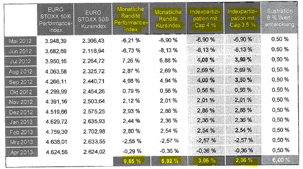 - Renditeeinbußen ergeben sich aus der angewendeten Addition der monatlichen Wertentwicklungen. Die Aufsummierung der monatlichen Renditen vernachlässigt den Zinseszinseffekt und schmälert somit die Rendite der Rückdeckungsversicherung. Die tatsächliche Wertentwicklung des Indexes ergibt sich aus der Differenz der Kurse zu Beginn und zum Ende des Betrachtungszeitraums, nicht aus der Aufsummierung der monatlichen Wertentwicklung. Die Wertentwicklungen des EURO STOXX 50® Index werden in den einzelnen Monaten einfach addiert. Besonders nachteilig ist, dass negative Entwicklungen voll und positive nur begrenzt durch den Cap in die Berechnung eingehen.